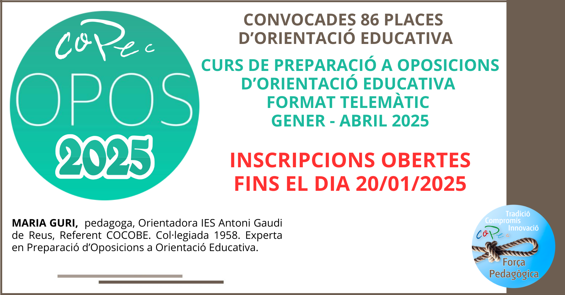 Curs de Preparació a Oposicions d’Orientació Educativa, adreçat a pedagogs/gues i psicopedagogs/gues que es presenten a la Convocatòria que ha fet el Departament d’Educació, RESOLUCIÓ EDF/4161/2024, de concurs oposició funció pública docent, en la que ha convocat 86 places d’ORIENTACIÓ EDUCATIVA.
