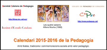 Ja us podeu descarregar el Calendari 2015-2016 de la Pedagogia, amb festes, tradicions i commemoracions socials amb valor pedagògic, que hem fet conjuntament la Societat Catalana de Pedagogia i el Col·legi de Pedagogs de Catalunya.