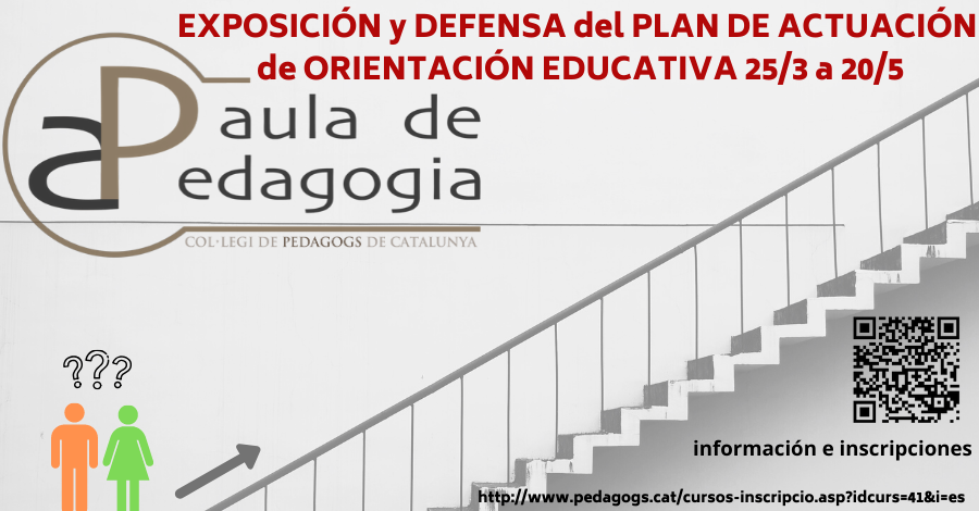 El Col·legi de Pedagogs organiza el curso de EXPOSICIÓN Y DEFENSA DEL PLAN DE ACTUACIÓN, dirigido a personas con experiencia que tengan hecho su Plan de Actuación, interesadas en profundizar y practicar esta etapa del proceso de oposiciones de la especialidad de Orientación Educativa.