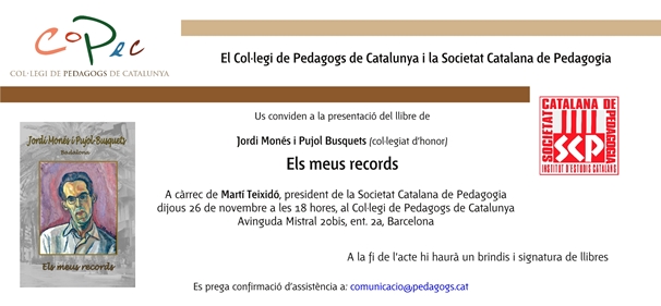 dijous 26 de novembre a les 18 hores, al Col·legi de Pedagogs de Catalunya (Avinguda Mistral 20bis, ent. 2a, Barcelona)