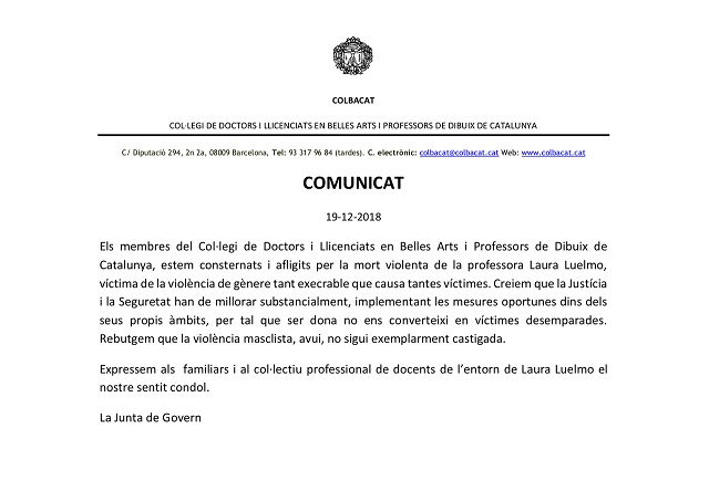 El Col·legi de Pedagogs de Catalunya (COPEC), membre de la Comissió de Dona i Igualtat de la Intercol·legial catalana, s'adhereix al COMUNICAT del Col·legi de Doctors i Llicenciats en Belles Arts i Professors de Dibuix de Catalunya (COLBACAT), de condemna per l'assessinat de la professora LAURA LUELMO.