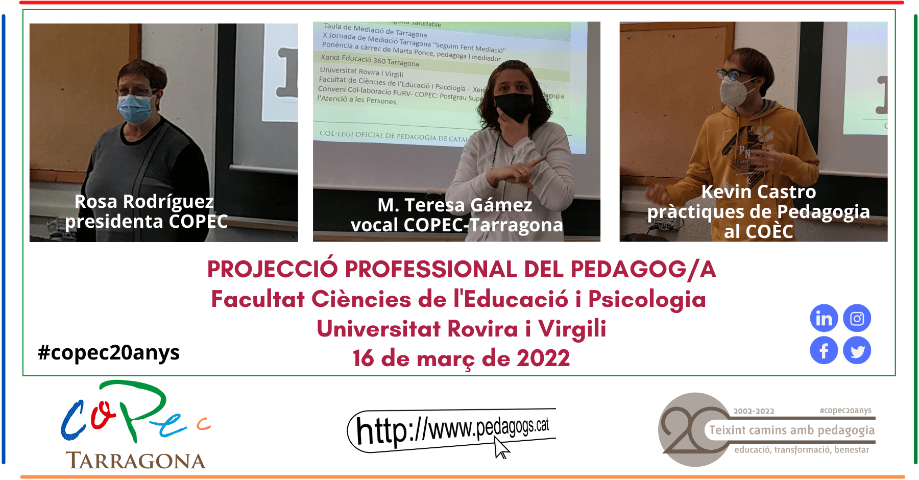 D’altra banda, vam comptar amb M. Teresa Gàmez vocal de COPEC a Tarragona que va abordar els projectes, activitats i representacions en què està involucrat el COPEC al camp de Tarragona. Animant als estudiants a què es puguin afiliar al COPEC sense cap cost mentre estant fent el grau, per gaudir dels avantatges que no són pocs, podent destacar la borsa de treball, les activitats formatives o l’orientació professional com alguns dels més sol·licitats, segons M. Teresa "és de vital importància estar col·legiat/da -i mentre s’estudia afiliar-se- perquè permet estar en contacte amb professionals de la pedagogia, tenir suport i acompanyament en el desenvolupament professional i garantir un exercici professional de qualitat."