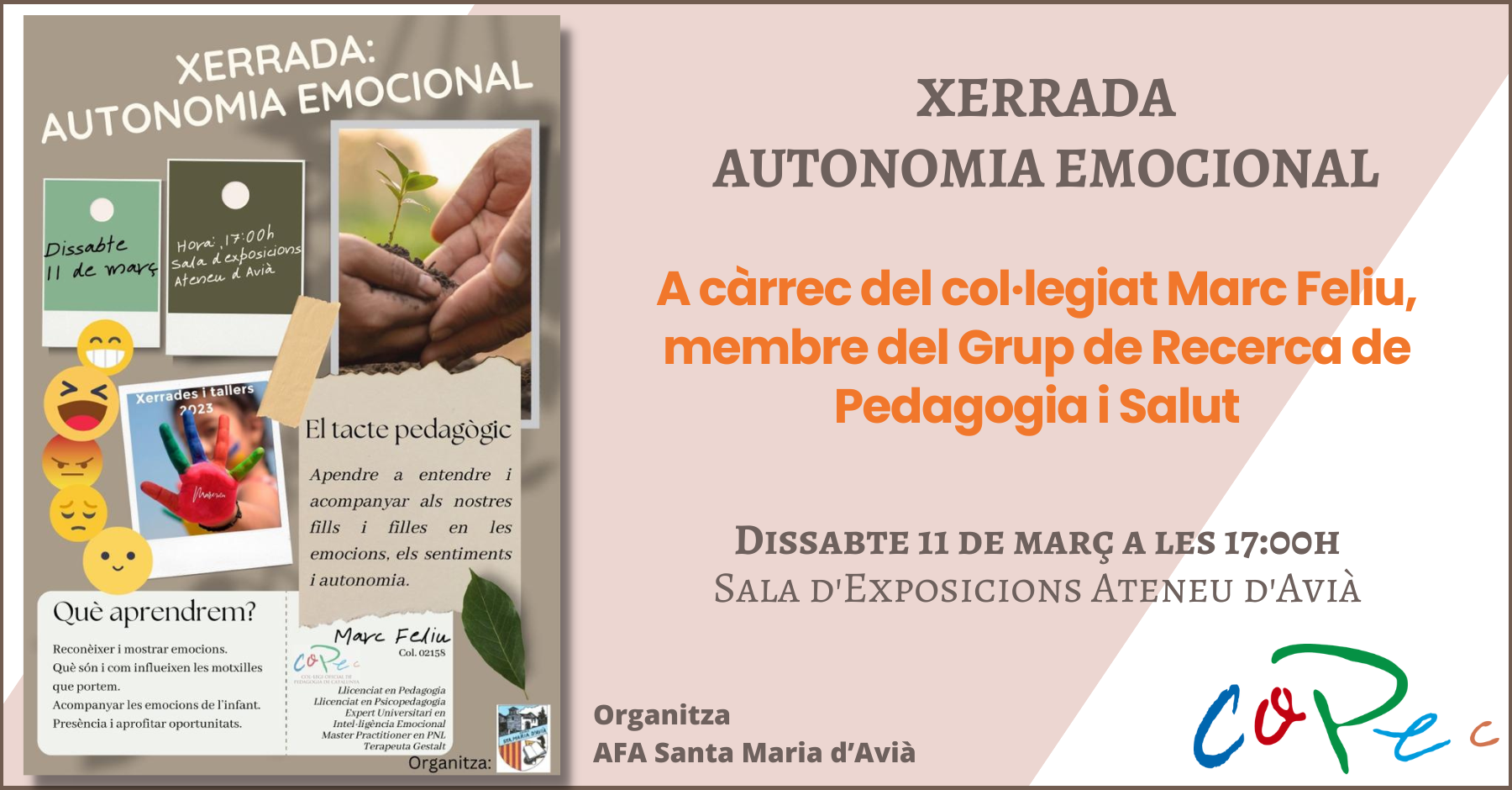 L’AFA Escola Santa Maria d’Avià convida a la xerrada “Autonomia emocional” el proper dissabte 11 de març a les 17:00h a la Sala d’exposicions de l’Ateneu d’Avià. Es tracta d’una activitat formativa, amb torn de preguntes al final.