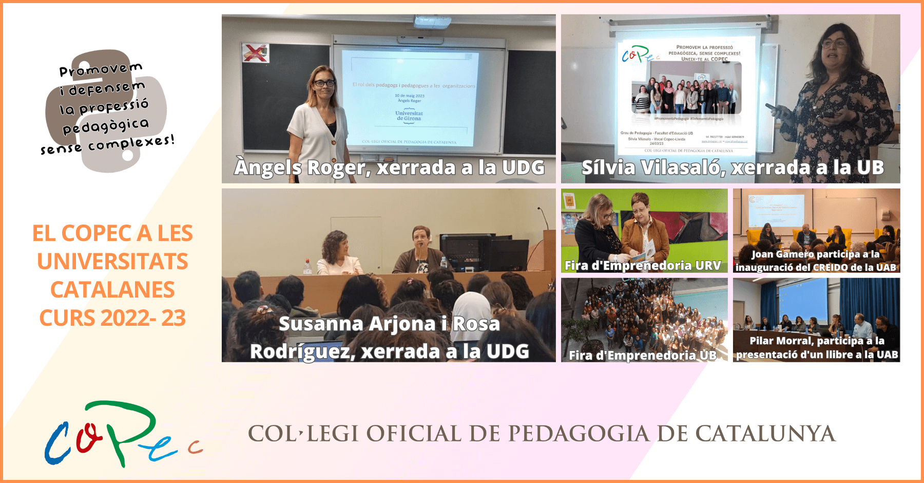 El Col·legi Oficial de Pedagogia de Catalunya (COPEC) ha estat actiu en universitats catalanes que fan Pedagogia al llarg del curs acadèmic 2022-2023. El COPEC ha estat present en diferents esdeveniments i activitats aportant la seva experiència i coneixement per fomentar el desenvolupament professional dels futurs pedagogs i pedagogues.