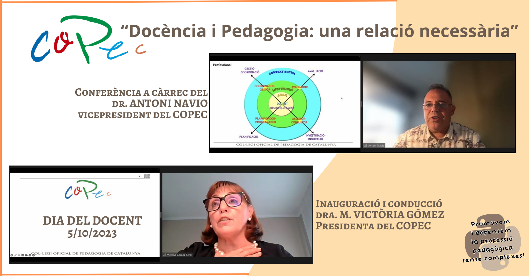 A més, la presidenta del COPEC, la Dra. M. Victòria Gómez, va destacar el paper essencial dels docents com a promotors de l’educació i models a seguir, relacionant aquesta tasca amb la professió pedagògica.