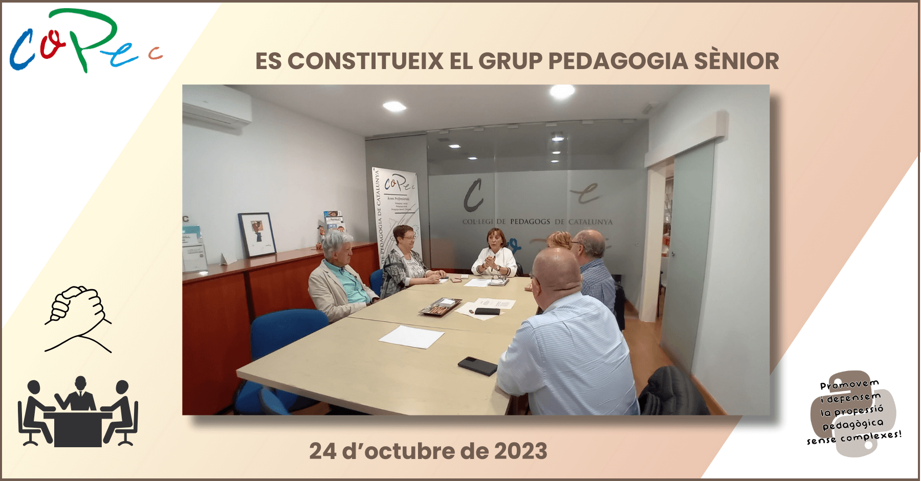 El passat dia 24 vam fer la primera trobada un petit (però potent) grup de col·legiats i col·legiades, per començar el que esperem sigui l’inici de la Comissió Sènior, del COPEC. El Grup Pedagogia Sènior del Col·legi de Pedagogia de Catalunya és una comissió del COPEC que vol impulsar als pedagogs i pedagogues i psicopedagogs i psicopedagogues jubilats i prop de la jubilació a través de l’organització d’activitats culturals, formatives i de lleure. En aquesta primera trobada es van posar les bases perquè el Grup de Pedagogia Sènior comenci a rodar. Els seus objectius són: