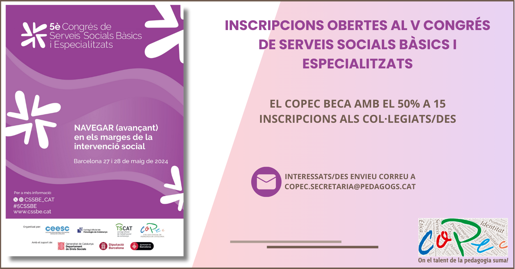 Les INSCRIPCIONS ja estan obertes per al V Congrés de Serveis Socials Bàsics i Especialitzats, organitzat conjuntament pel Col·legi Oficial d’Educadors i Educadores Socials de Catalunya, el Col·legi Oficial de Treball Social de Catalunya, el Col·legi Oficial de Psicologia de Catalunya i el Col·legi Oficial de Pedagogia de Catalunya, sota el lideratge enguany del CEESC.