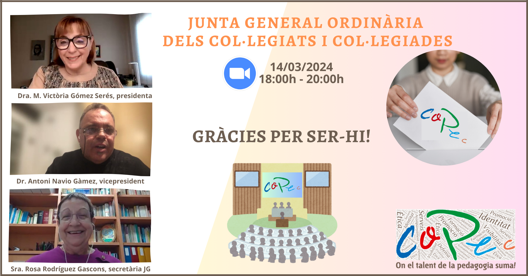 Em plau convocar-te a la Junta General Ordinària del Col·legi Oficial de Pedagogia de Catalunya (la nostra assemblea) de la que formes part, que es farà el 14 de març de 2024, a les 18:00h en primera convocatòria i a les 18:30h en segona, mitjançant la plataforma ZOOM.