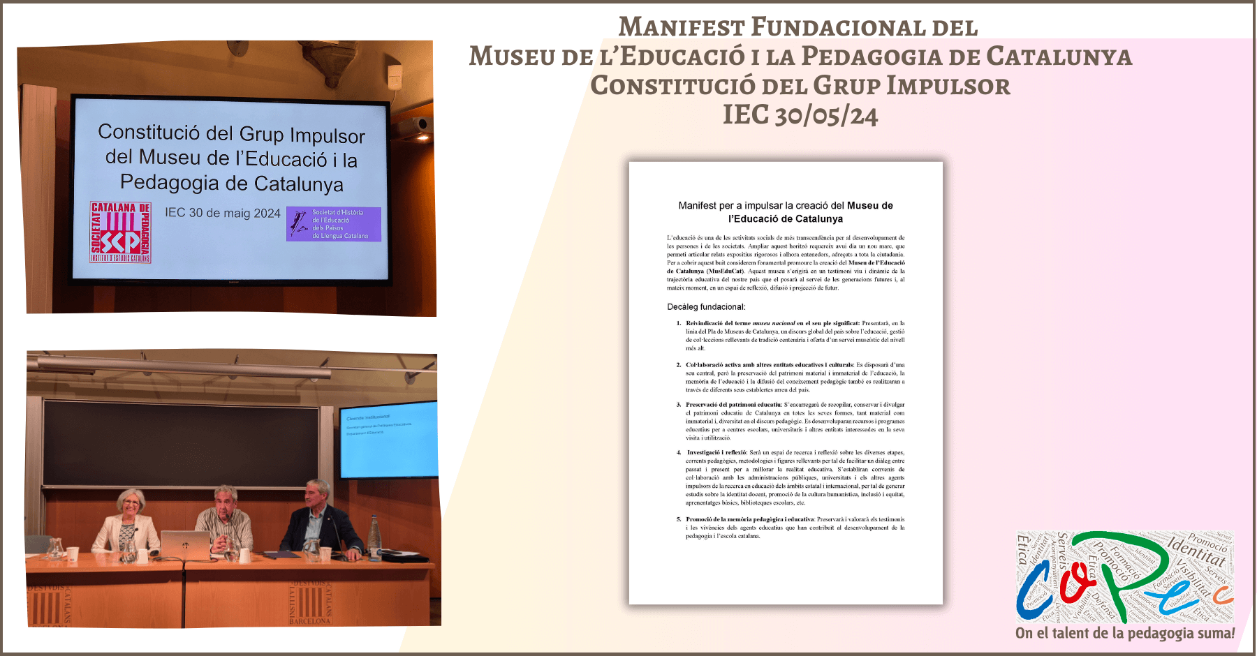 En el marc de l’acte s’ha llegit el MANIFEST FUNDACIONAL, en forma de decàleg, que posa les bases per la creació del MusEduCat. MANIFEST al que el Col·legi Oficial de Pedagogia de Catalunya, s’hi ha adherit. I del que els promotors han demanat es faci la màxima difusió possible per a què arribi a tota la societat civil catalana.