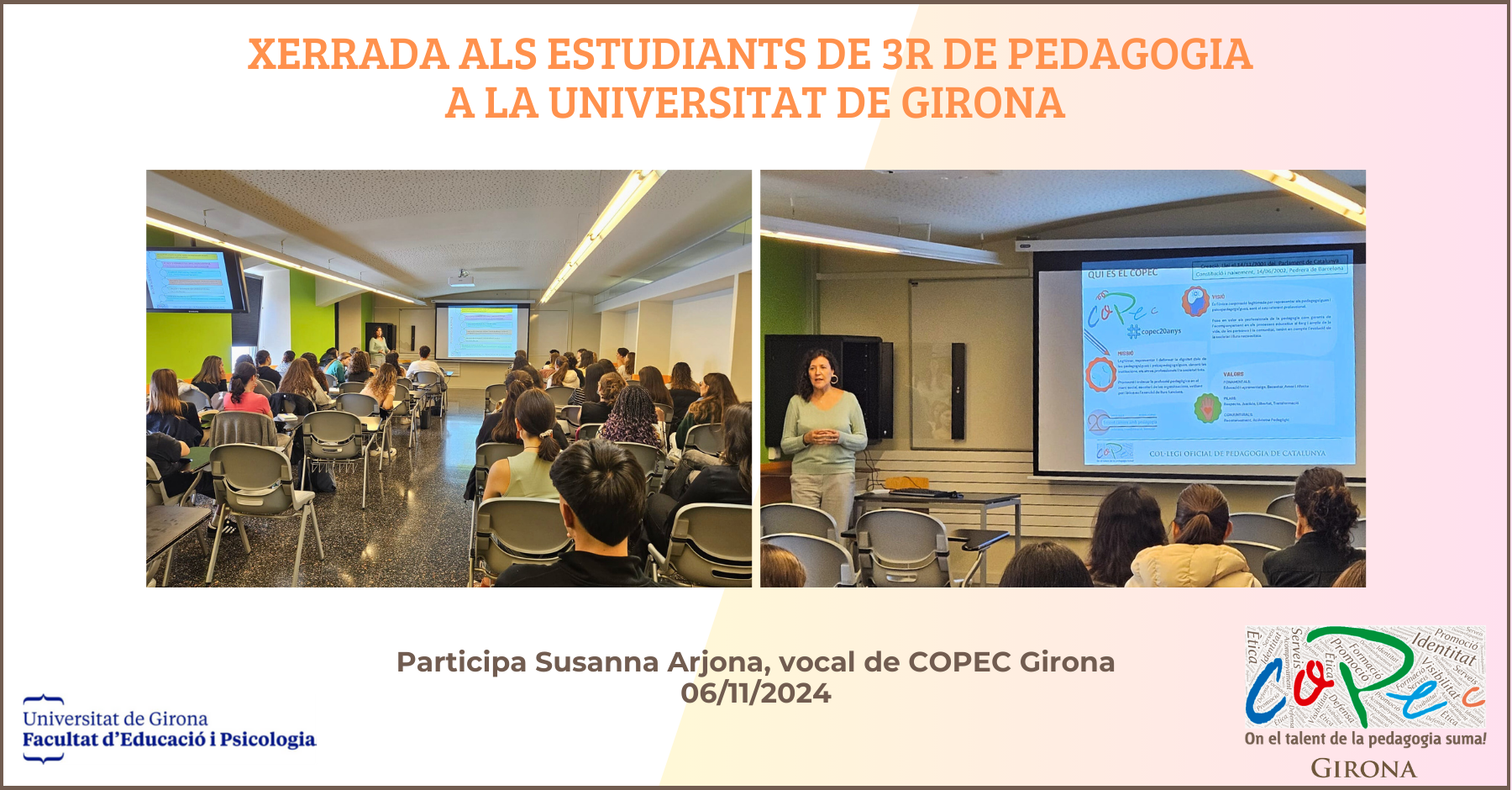 Avui 6 de novembre, Susanna Arjona, vocal del COPEC a Girona, ha participat en una xerrada adreçada als estudiants de tercer de Pedagogia a la Facultat d’Educació i Psicologia de la UdG. L’activitat, organitzada dins de l’assignatura "Projecció Professional de la Pedagoga i el Pedagog" que imparteix el professor Jaume Torroella, pedagog i membre del Consell Social del COPEC, ha tingut l’objectiu de presentar el COPEC als futurs pedagogs i pedagogues.
