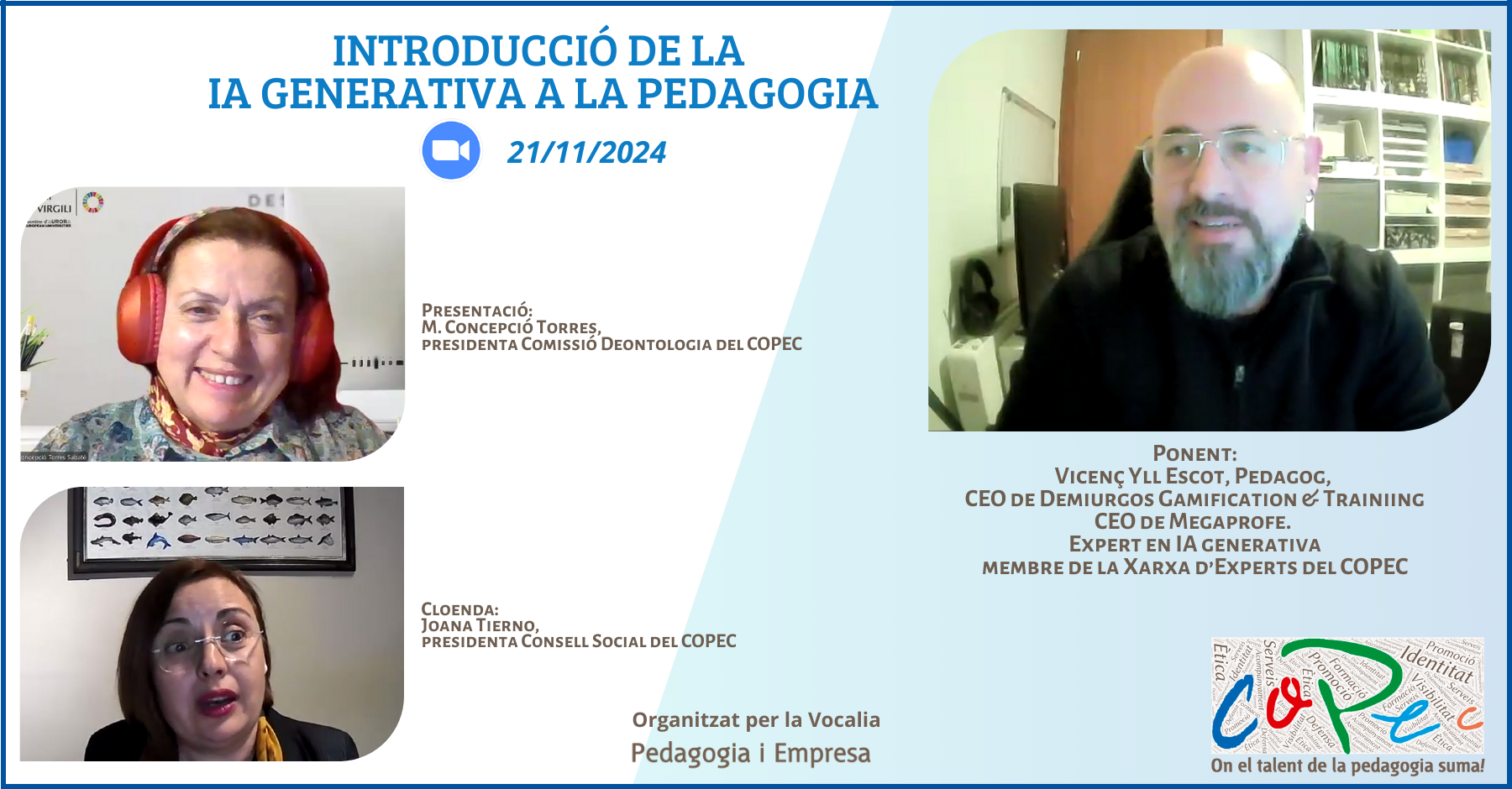 L’ha inaugurat la Dra. M. Concepció Torres, presidenta de la Comissió de Deontologia, qui ha posat en valor la diversitat de webinars pedagògics que s’organitzen: “El COPEC ens mostra el mosaic de vessants que te la pedagogia i s’adapta i actualitza contínuament en eines, estratègies, tecnologia. Avui en tenim un exemple: com poden els pedagogs/gues i psicopedagogs/gues aplicar la IA Generativa en l’àmbit de la Pedagogia”.