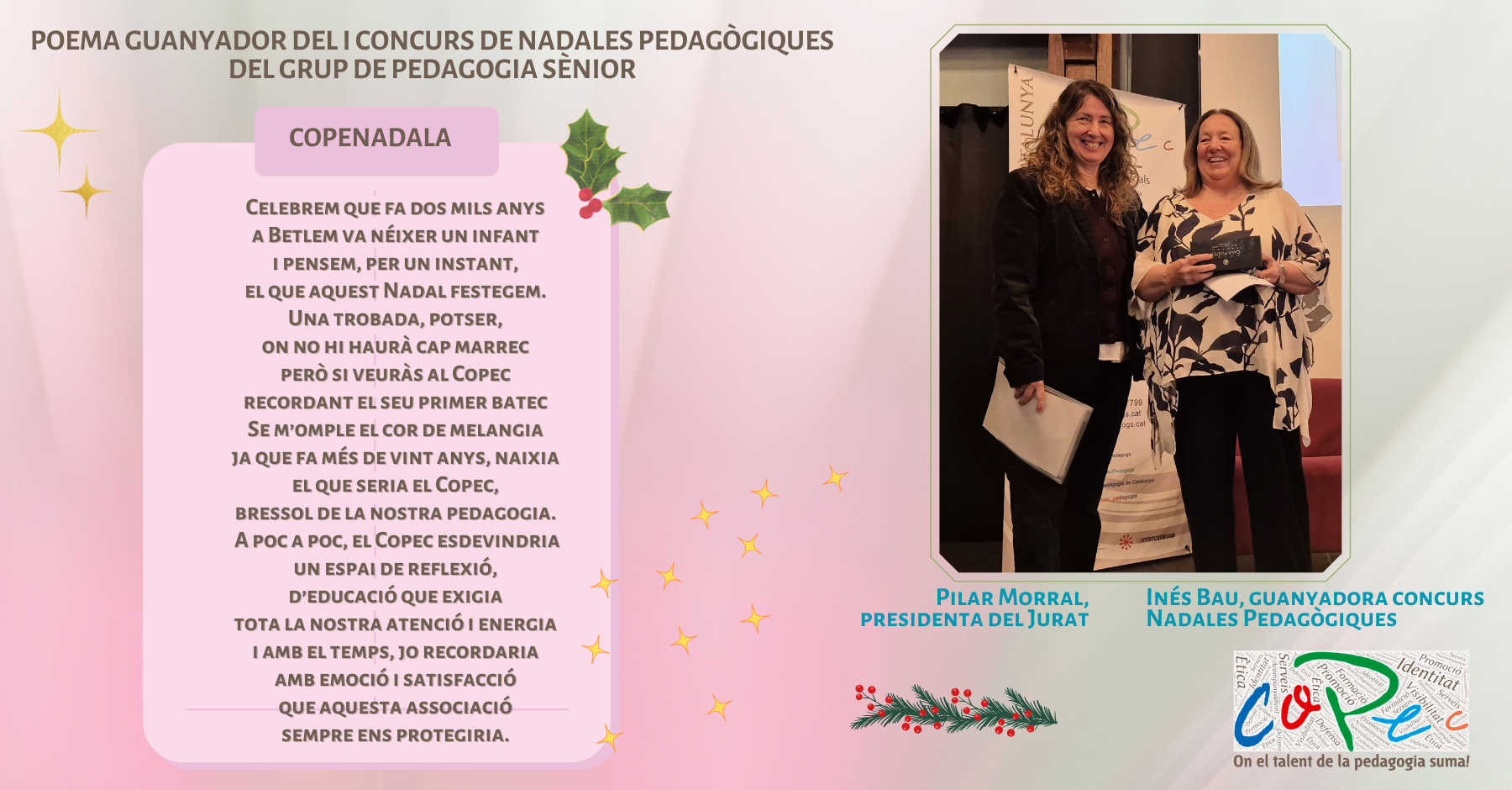 Celebrem que fa dos mils anys a Betlem va néixer un infant i pensem, per un instant, el que aquest Nadal festegem. Una trobada, potser, on no hi haurà cap marrec però si veuràs al Copec recordant el seu primer batec Se m’omple el cor de melangia ja que fa més de vint anys, naixia el que seria el Copec, bressol de la nostra pedagogia. A poc a poc, el Copec esdevindria un espai de reflexió, d’educació que exigia tota la nostra atenció i energia i amb el temps, jo recordaria amb emoció i satisfacció que aquesta associació sempre ens protegiria.