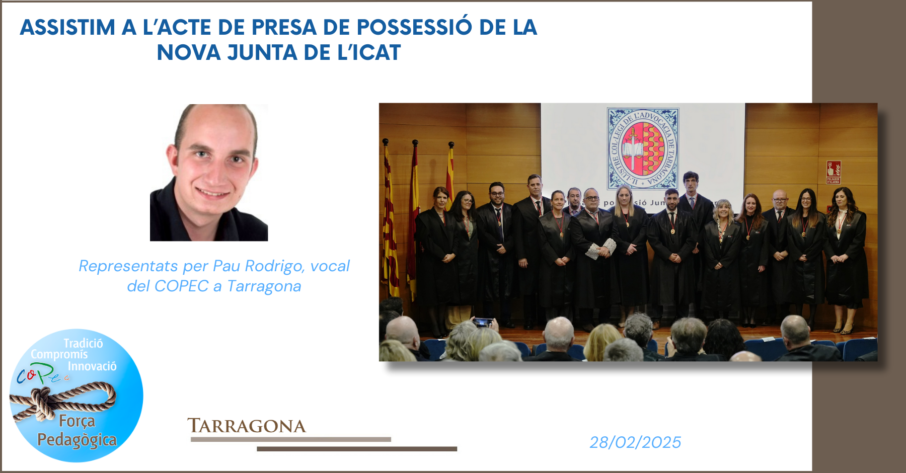 En representació del Col·legi Oficial de Pedagogia de Catalunya, Pau Rodrigo, vocal del COPEC a Tarragona, va assistir a l’acte per mostrar el suport i reforçar la importància de la cooperació entre col·legis professionals.
