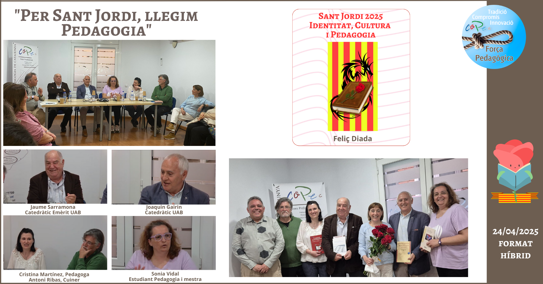 El COPEC us convida a l’acte especial de Sant Jordi, "Per Sant Jordi, Llegim Pedagogia" que tindrà lloc el dijous 24 d’abril de 2025 a les 17:30h en format híbrid, combinant la presencialitat a la nostra seu (Avinguda Mistral, 20, bis entresol 2a, Barcelona) amb la participació en línia mitjançant la Plataforma Zoom.