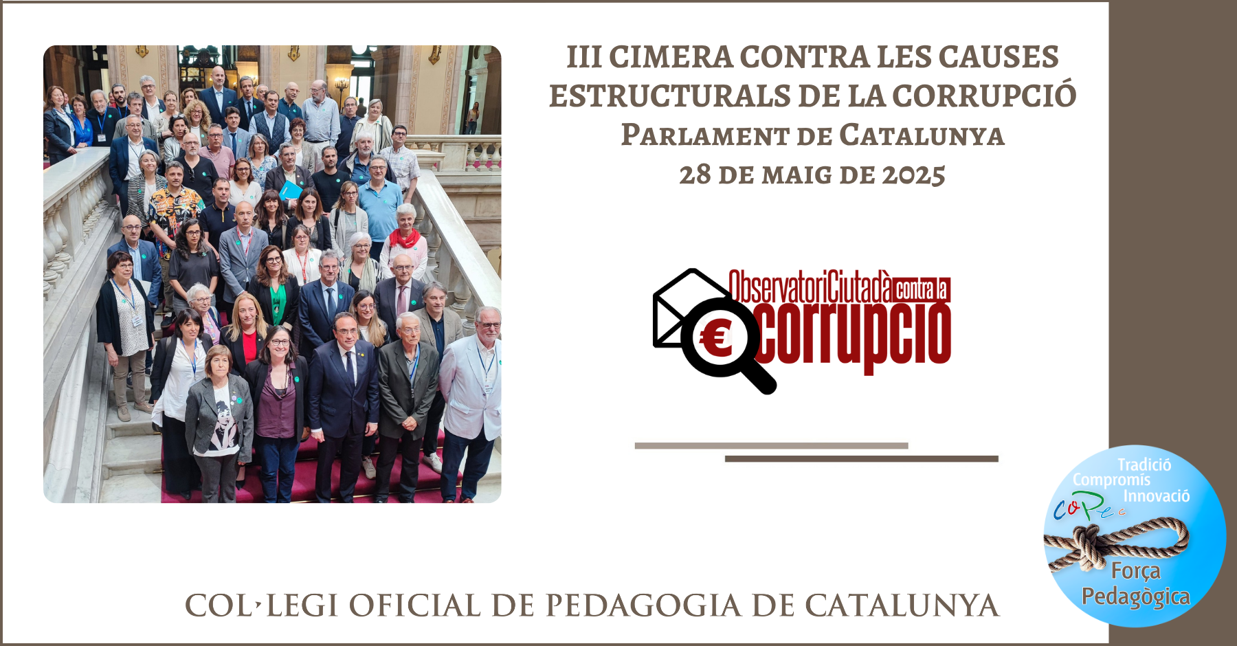Avui dimecres 28 de maig el Col·legi Oficial de Pedagogia de Catalunya (COPEC), com a entitat signant del PACTE SOCIAL, ha estat present a la III Cimera contra les causes estructurals de la corrupció, convocada pel President del Parlament, MH Josep Rull i la Presidenta de l’Observatori Contra la Corrupció (O3C), Sra. Itziar González.