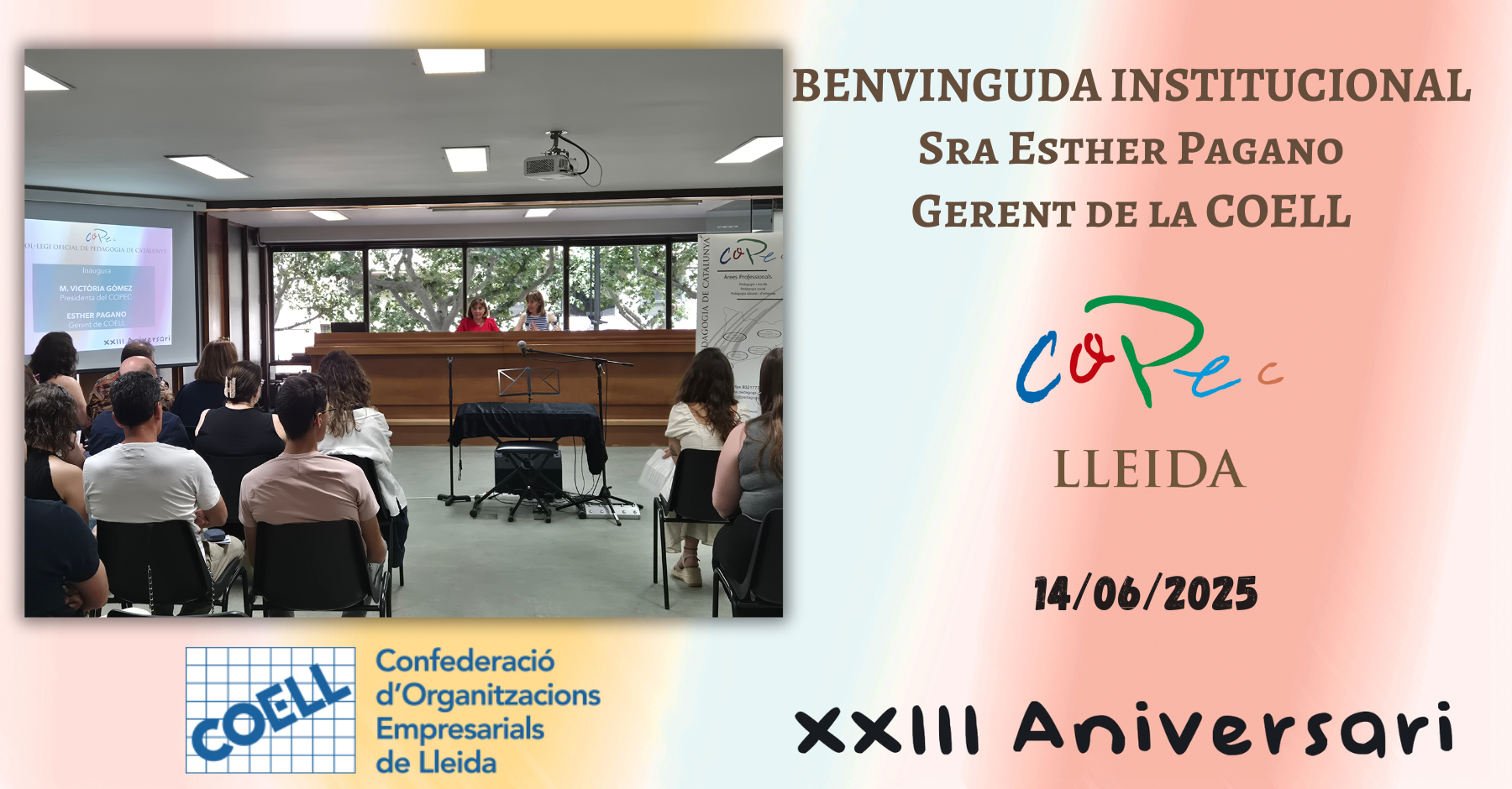 Vull saludar molt especialment a la presidenta actual del COPEC, Sra. M. Victòria Gómez i també a l’anterior presidenta, Sra. Rosa Rodríguez, amb qui encara compartit molts anys de treball conjunt des de la COELL, sempre amb una col·laboració fluida i compromesa. També vull fer un agraïment sincer a la representant territorial de Lleida, Sra. Sílvia Vilasaló, per la seva proximitat i implicació constant.