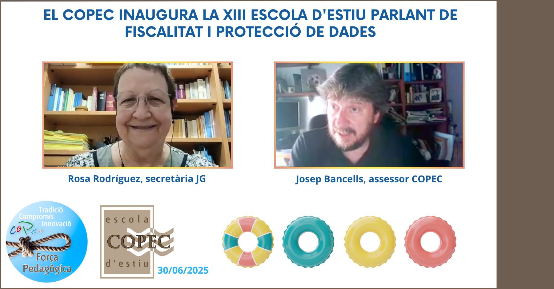 Ahir 30 de juny, el Col·legi Oficial de Pedagogia de Catalunya va iniciar la XIII Escola d’Estiu a través de la plataforma ZOOM amb el curs "Què he de tenir en compte si treballo per compte propi? (Fiscalitat i protecció de dades)", amb la participació de l’assessor del COPEC Josep Bancells i Rosa Rodríguez, secretària de la Junta de Govern.