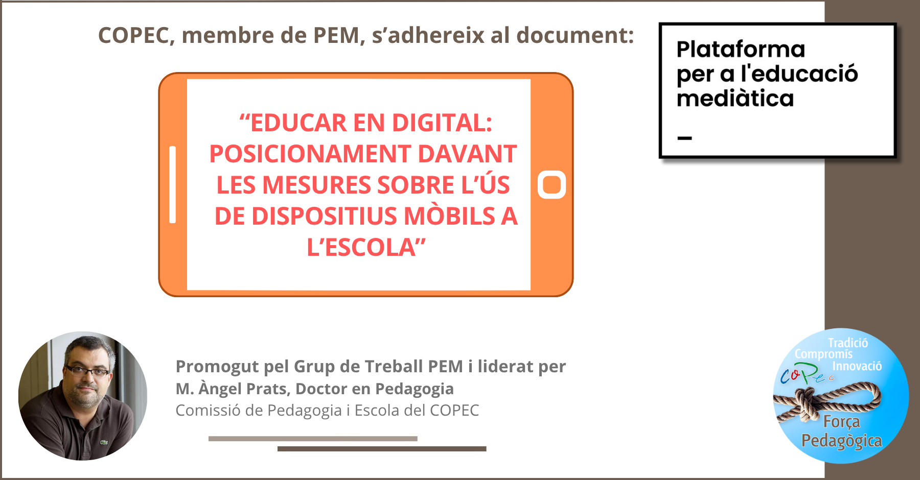 Document promogut pel Grup de Treball i liderat per Miquel Àngel Prats (Comissió de Pedagogia i Escola del COPEC), que davant les mesures envers l’ús dels mòbils a les escoles, vol posar de manifest que l’educació digital ha de fonamentar-se des d’una mirada positiva, crítica i constructiva sobre l’alfabetització mediàtica, i no en la prohibició de les pantalles, sinó en el desenvolupament de competències digitals per a un ús conscient i saludable i garantir una convivència equilibrada amb les tecnologies digitals.