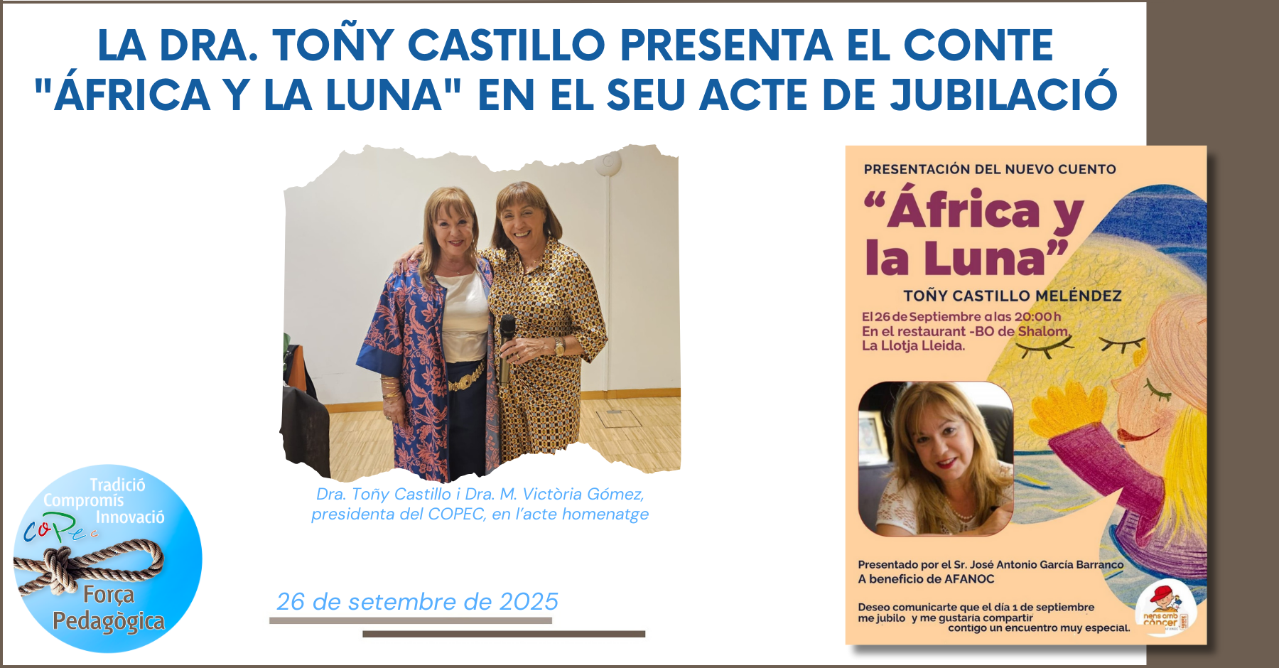 El passat 26 de setembre, la Llotja de Lleida va acollir l’acte de comiat de la Dra. Toñy Castillo Meléndez, docent de l’Aula Hospitalària Dr. Antoni Cambrodí de l’Hospital Universitari de Lleida i coordinadora del Grup de Pedagogia i Salut del COPEC, que es jubila després de més de 40 anys de trajectòria dedicada a la pedagogia, a la docència i a la promoció de projectes educatius amb una forta dimensió humana i social.