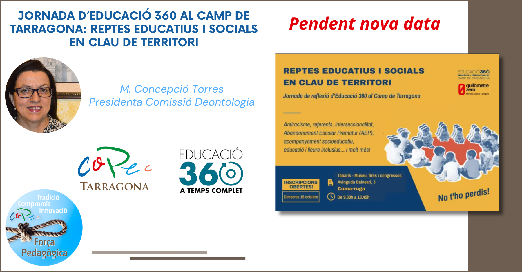 La M. Concepció Torres, presidenta de la Comissió de Deontologia del COPEC i representant del Col·legi a la Xarxa d’Educació 360 al Camp de Tarragona, hi participarà com a moderadora de la taula “Acompanyament socioeducatiu des de diferents mirades professionals”, un espai que visibilitzarà la pluralitat d’enfocaments i rols que intervenen en l’acompanyament educatiu.