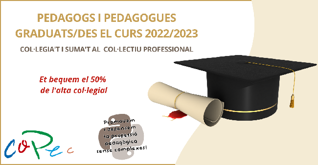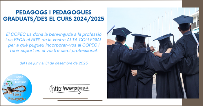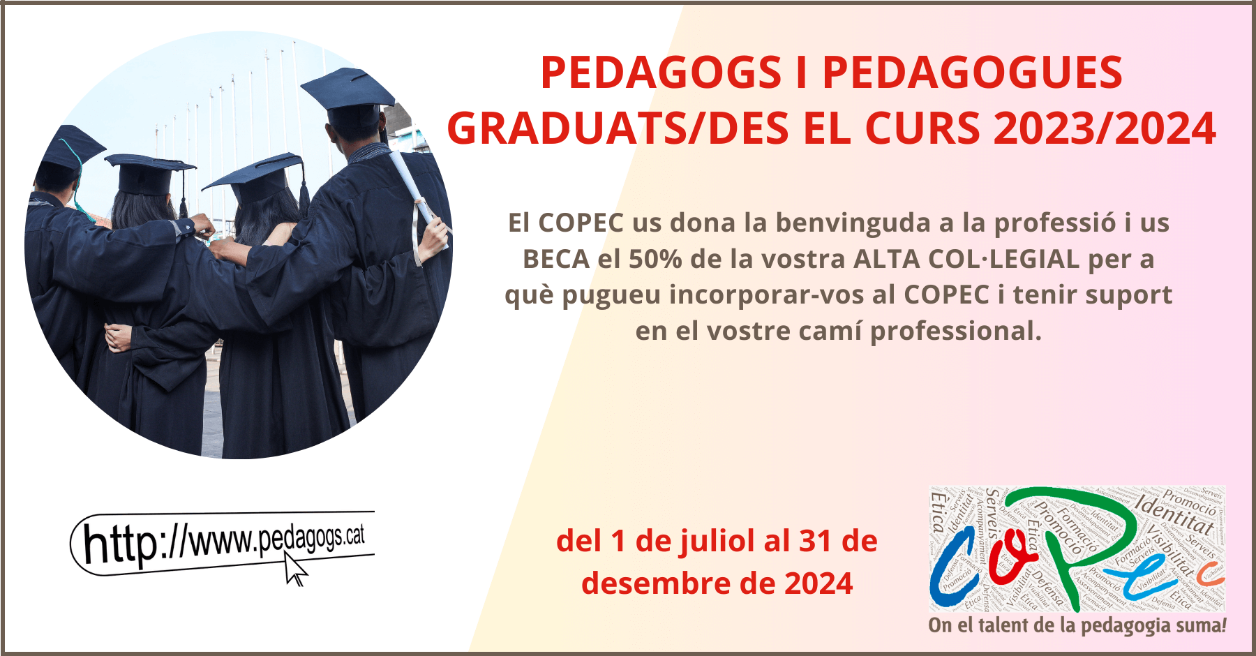 El Col·legi Oficial de Pedagogia de Catalunya, referente profesional de los pedagogos/las pedagogas y psicopedagogos/las psicopedagogas, os da la bienvenida a la profesión y os CONCEDE la BECAS del 50% de vuestra ALTA COLEGIAL para que podáis incorporaros al COPEC y contar con apoyo en vuestro camino profesional.