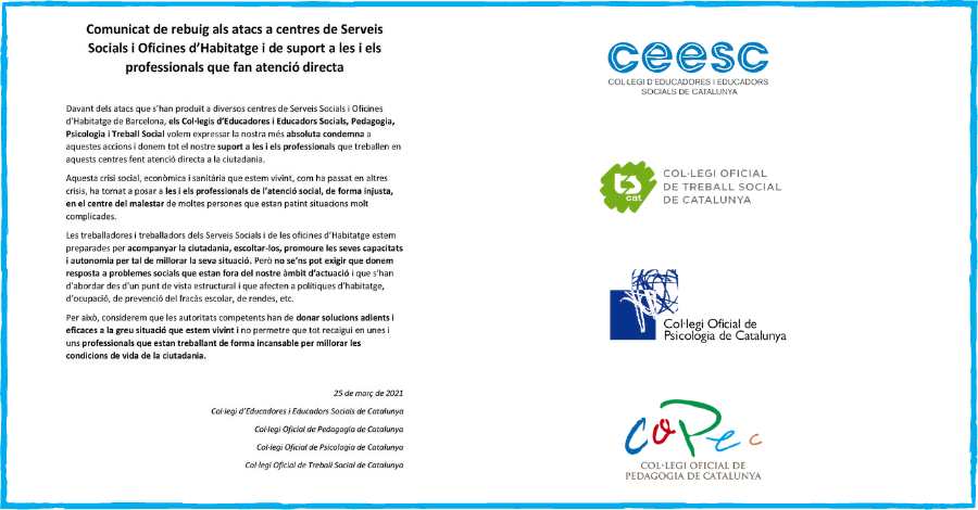 Ante los ataques que se han producido en distintos centros de Serveis Socials i Oficines d’Habitatge de Barcelona, los Colegios de Educadores y Educadoras Sociales, Pedagogía, Psicología y Trabajo Social queremos expresar nuestra más absoluta condena a estas acciones y damos todo nuestro apoyo a las y los profesionales que trabajan en estos centros realizando atención directa a la ciudadanía.