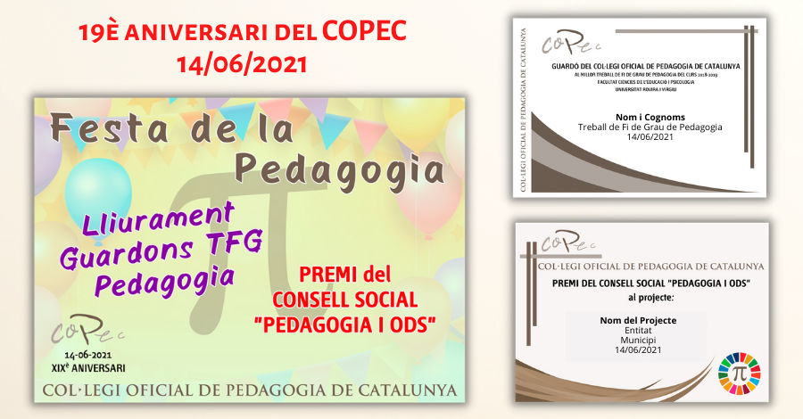 En el 19.º cumpleaños del Col·legi Oficial de Pedagogia de Catalunya y las Facultades de Educación de las Universidades UB, UAB, URV y UdG, celebran un acto pedagógico y festivo en formato telemático, para entregar los Galardones a los mejores Trabajos de Grado de Pedagogía y los Premios del Consell Social "Pedagogía y ODS".