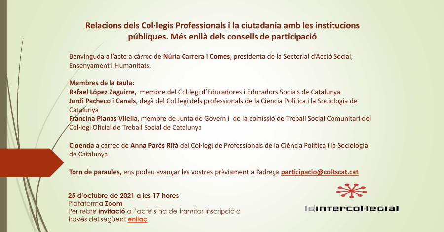 La Sectorial de Acción Social, Enseñanza y Humanidades, de la Intercol·legial, de la que el COPEC forma parte representado por ANTONI NAVIO, miembro de la Junta de Gobierno, ha organizado el 25/10/2021 a las 17h: