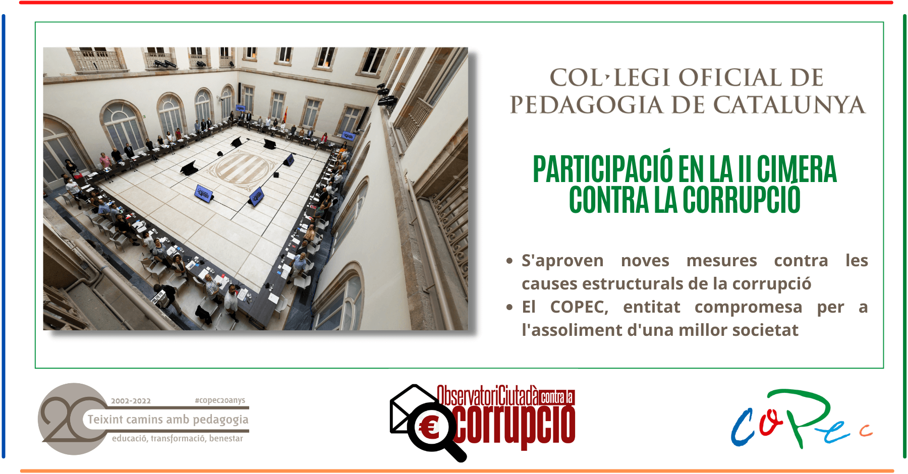 El Col·legi Oficial de Pedagogia de Catalunya acordó el pasado sábado 21 de mayo, en la última reunión de la Junta de Gobierno, la adhesión del COPEC al Pacto Social Contra la Corrupción, impulsado por el Parlament Ciutadà, y liderado por la portavoz ITZIAR GONZÀLEZ, arquitecta y activista social.