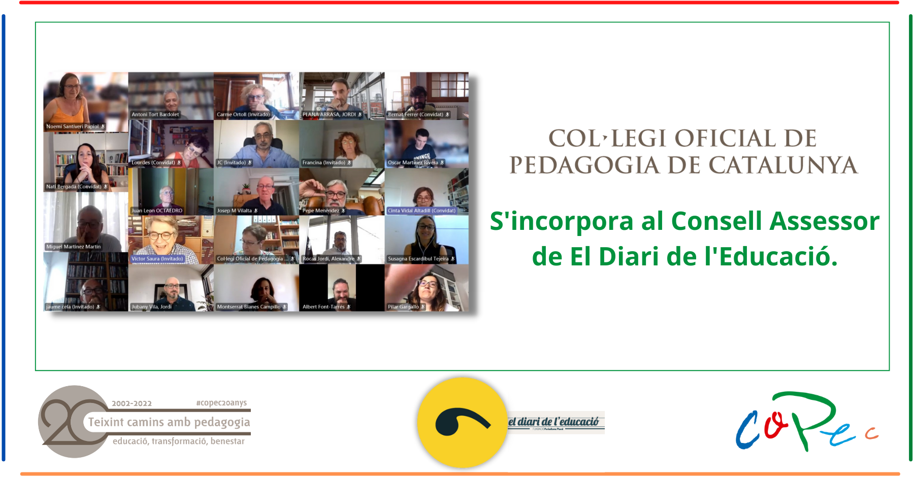 El Col·legi Oficial de Pedagogia de Catalunya, agradece en EL DIARI DE L’EDUCACIÓ la oportunidad de aportar valor pedagógico en este medio que acontece referente del ámbito educativo.