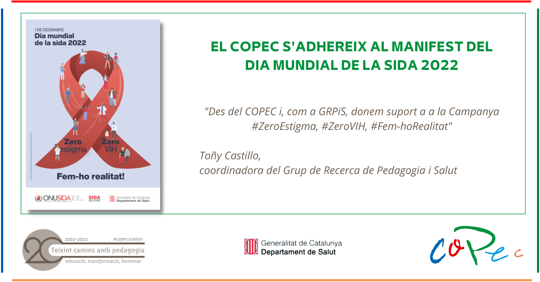 Generalitat de Catalunya - Departament de Salut, 061 CatSalut Respon, Associació Benestar i Desenvolupament (ABD), Associació Comunitària Anti-sida de Girona (ACAS), Associació Catalana per la Integració d’Homosexuals, Bisexuals i Transsexuals Immigrants (ACATHI), Actuavallès, AEC GRIS Grup de Reinserció, Associació d’Estudiants de Ciències de la Salut 2017 (AECS) , Pla Local de Drogues de Terrassa (AIDE), Associació d’Ajuda i Reinserció del Toxicòman (ALBA), Àmbit Prevenció - Ass. Per a la Salut i la Qualitat de Vida, Asociación de Pacientes Dependientes a Opiáceos (APDO), Associació de Serveis i Formació Socioeducativa (ARA), Associació Reus Som Útils (ARSU), Associació d’Intervenció Comunitària en Drogues (Asaupam), Associació Comunitària de Salut Sexual del Camp de Tarragona (Assexora’t), Associació Antisida Lleida, Associació de Planificació Familiar de Catalunya i Balears, Associació Êthos, Associació EX-AEQUO, Associació Salut i Família, Asociación para el Trasplante de Órganos a Seropositivos (ATOS), Ass. UNESCO per al Diàleg Interreligiós (AUDIR), BCN checkpoint, Associació Catalana d’Empreses per a Gais i Lesbianes (Cambra LGTBIQ+ ACEGAL), Casal lambda, Catalan Network of People who Use Drugs (Catnpud), Centro de Estudios sobre Promoción de la Salud (CEPS salut), Centre Jove d’Atenció a les Sexualitats (CJAS), Plataforma Unitària d’ONG VIH-sida de Catalunya (Comitè 1r. Desembre), Creación Positiva, Creu Roja Catalunya, EL Lloc de la Dona, Equip de Treball sobre Inmigració i Salut (ETIS), Federació Catalana de Drogodependències (FCD), Fundació Lluita contra la Sida (FLS), Fundació Acollida i Esperança, Fundació ACSAR, Fundació APIP-ACAM, Fundació Autònoma Solidària, Fundació Doctor Ferran, Fundació Esportsalus, Fundació Ires, Fundació pel Suport Social Solidari, Fundació Salut i Comunitat, Fundació Sida i Societat, Gais Positius, Cooperativa d’Iniciativa Social (GEDI), Genera, Grup ATRA (ATRA i ATART), GTT, H2O Gais, Lesbianes, Transsexuals i Bisexuals del Camp de Tarragona, Hispanosida, Joves per la Igualtat i la Solidaritat (JIS), Joves Positius, LGTBI Mataró, Metges del Mon, Promoció i Desenvolupament Social (PDS), Pla d’acció sobre drogues Reus (HUSJR), Programa Carretera - Comunitat Terapèutica del Maresme Serveis de Salut Mental, Projecte dels Noms, Sicar – Adoratrius, Sida Studi, Stop, Teatracció, Sistema d’Emergències Mèdiques (SEM), Unió Sindical Obrera de Catalunya (USOC), Unió General dels Treballadors de Catalunya (UGT), Col·legi Oficial de Treball Social de Catalunya (TSCAT), La Unió. Fundació, La Unió. Associació d’entitats sanitàries i socials, Federació de Municipis de Catalunya (FMC), Diputació de Tarragona, Diputació de Lleida, Diputació de Girona, Diputació de Barcelona, Consorci Sanitari del Maresme (CSdM), Consorci de Salut i Social de Catalunya (CSC), Consorci Sanitari de Barcelona (CSB), Corporació de Salut del Maresme i la Selva, Col·legi Oficial de Pedagogia de Catalunya (COPEC), Col·legi Oficial de Psicol·logia de Catalunya (COPC), Consell de Col·legis Farmacèutics de Catalunya, Consell de Col·legis d’Infermeres i Infermers de Catalunya, Consell de Col·legis de Metges de Catalunya, Consell Nacional de la Joventut de Catalunya (CNJC), Centre Jove de Salut Girona, Col·legi d’Educadores i Educadors Socials de Catalunya (CEESC), Centre d’Estudis Epidemiològics sobre les Infeccions de Transmissió Sexual i Sida de Catalunya (CEEISCAT), Comissions Obreres Sanitat (CCOO), Societat Catalana de Medicina Familiar i Comunitària (CAMFIC), Agència de Salut Pública de Barcelona (ASPB), Ajuntament de Barcelona, Associació Infermeria Familiar i Comunitària (AIFICC), Associació Catalana de Municipis i Comarques (ACM), Associació Catalana d’Entitats de Salut (ACES), Delegació de Catalunya i Aragó (ADIF), Institut Metropolità del Taxi (AMB), Centre Cultura Contemporània de Barcelona (CCCB), Corporació Catalana de Mitjans Audiovisuals (Catalunya Ràdio / TV3) (CCMA), Ferrocarrils de la Generalitat de Catalunya (FGC), Institut del Teatre, Museu d’Art Contemporani de Barcelona (MACBA), Museu Nacional d’Art Catalunya (MNAC), Ràdio 4 (RNE), Teatre Nacional de Catalunya, Televisió Espanyola a Catalunya, Antena 3, Transports Metropolitans de Barcelona (TMB), Teatre Victòria / Teatre Poliorama (3xtr3s), RCD Espanyol, Ràdio Salut, Ràdio Marca, Ràdio Estel / Catalunya Cristiana, Organización Nacional de Ciegos Españoles (ONCE), Obra Social “La Caixa”, Mango, La Xarxa, INPROSS, Institut d’Estudis de la Sexualitat i Parella (IESP), Fundació FC Barcelona, El Corte Inglés, El 9 Nou / El 9 TV / EL 9 FM, Diari Segre, Diari Regió 7, Diari La Mañana, Diari El Punt Avui, Diari El Periódico, Diari El Mundo, Diari de Tarragona, Diari de Girona, Diari ARA, Cobega Coca-cola.