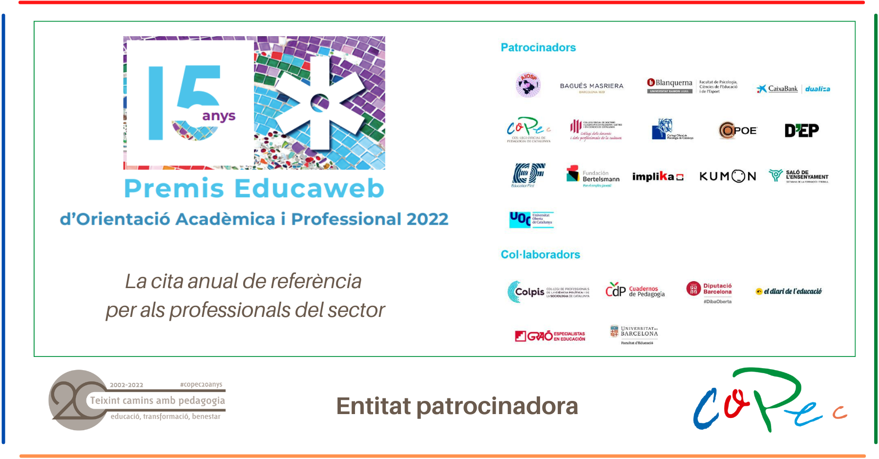 Ayer, 1 de diciembre, tuvo lugar la 15.ª Edición de los Premios Educaweb de Orientación Academia y Profesional, premios en los que el COPEC es entidad patrocinadora, y en el que Joan Gamero, vocal de Pedagogía y Escuela, siguió el acontecimiento que se retransmitió íntegramente por streaming, en representación del COPEC.