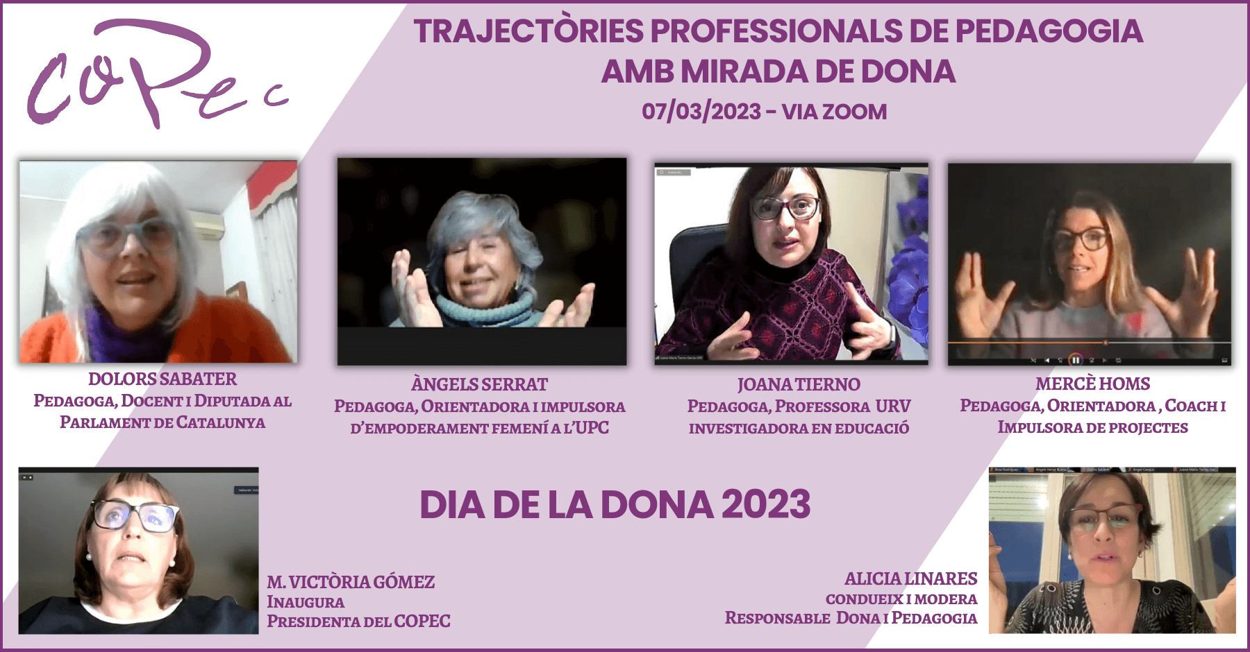 El acto fué inaugurado por la presidenta del Col·legi Oficial de Pedagogia, María Victòria Gómez, quien en su Parlamento puso énfasis en: "Hoy, acompañadas de pedagogas con trayectoria profesional, el COPEC pone su grano de arena para reivindicar la igualdad de oportunidades en todos los ámbitos y para frenar las tendencias anti-feministas que quieren desestabilizarlo".