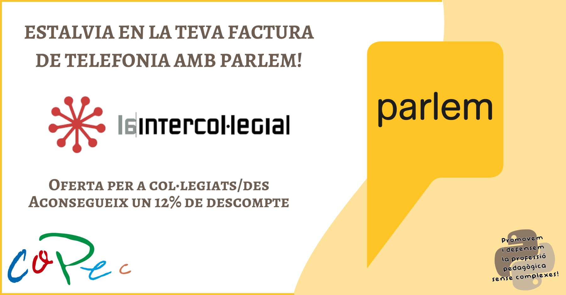 Colegiados y colegiadas, queremos informaros que el COPEC, en colaboración con la Intercol·legial de la que formamos parte, ha establecido un convenio con la compañía telefónica PARLEM para que podamos disfrutar de un 12% de descuento en las tarifas de telefonía disponibles en www.parlem.com.