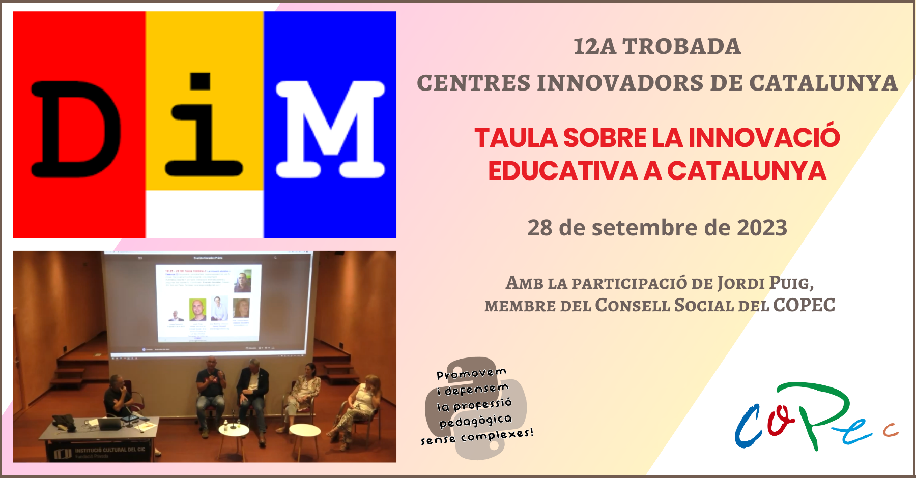 Dentro del marco del 12º Encuentro de Centros Innovadores en Cataluña organizada por la Red Social Dim-Edu, el Doctor en Pedagogía Jordi Puig, miembro del Consejo Social del COPEC, participó en la mesa redonda "La Innovación Educativa en Cataluña", que reunió a expertos del ámbito educativo. La mesa redonda tuvo lugar el 28 de septiembre y fue moderada por Evaristo González, director del IES Torre del Palau en Terrassa.