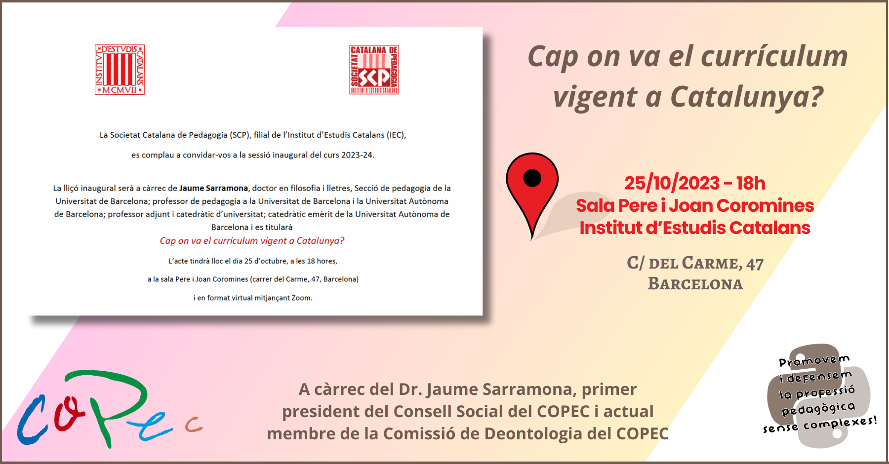 LA SOCIETAT CATALANA DE PEDAGOGIA INAUGURA EL CURSO 2023-2024 CON EL DR. JAUME SARRAMONA