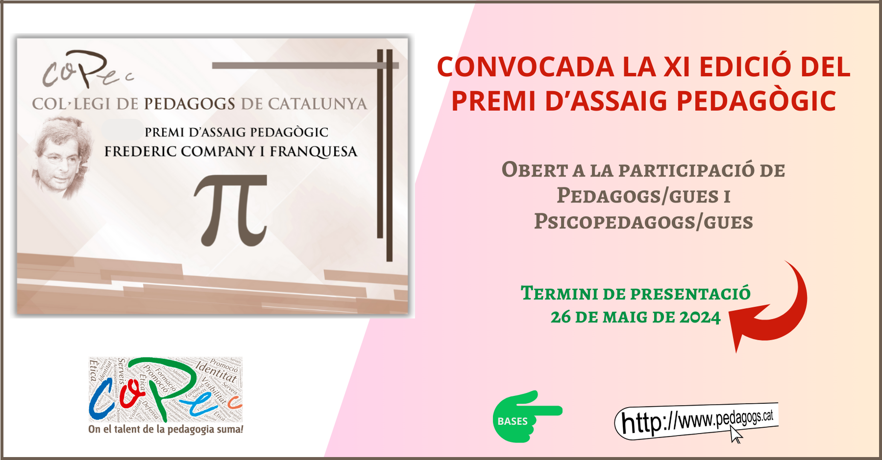 El Col·legi de Pedagogs de Catalunya convoca este año la XI edición del Premio de Ensayo Pedagógico Frederic Company i Franquesa, con el tema: "Desafíos de la Pedagogía en un mundo inteligentemente artificial".