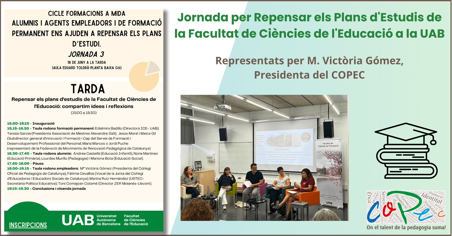participación de representantes de diferentes sectores educativos, incluyendo a M. Victoria Gómez presidenta del COPEC, Fàtima Cevallos de la Junta del Col·legi d’Educadors i Educadores Socials de Catalunya, Marina Ruiz de USTEC- Secretària de Política Educativa y Toni Comajoan, Director ZER Moianès i Llevant, que han hablado sobre el perfil que deben tener los