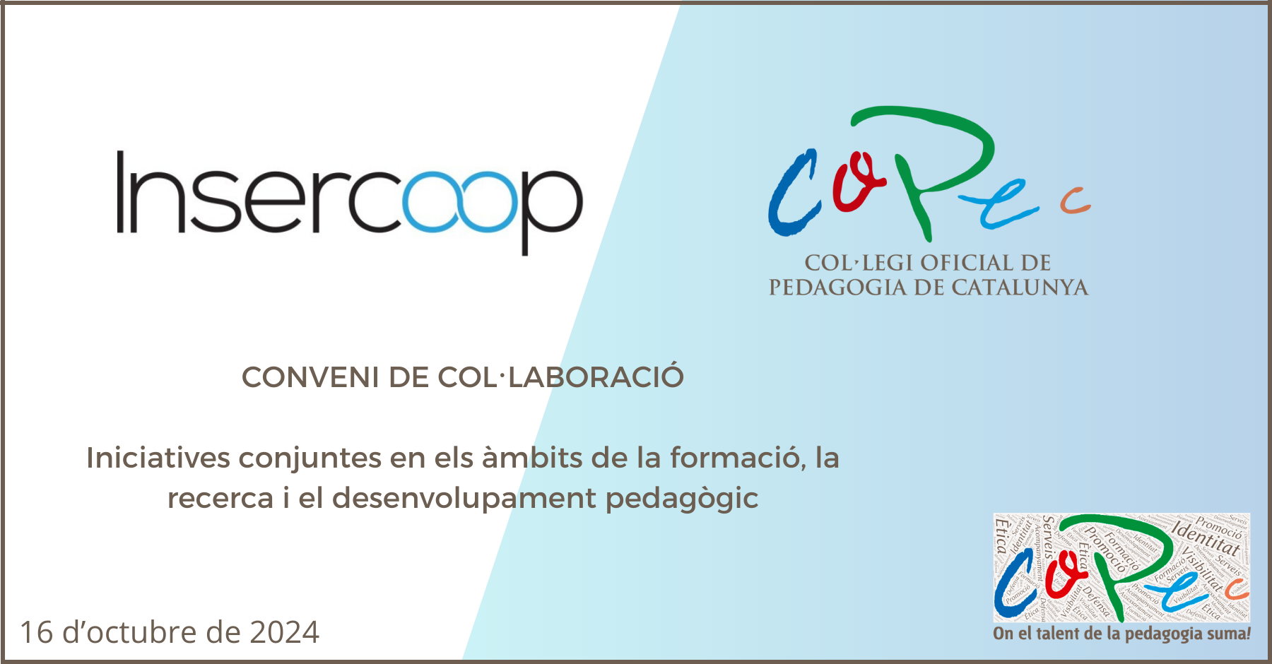 Con fecha 16 de octubre de 2024, el Col·legi Oficial de Pedagogia de Catalunya y Insercoop SCCL han firmado un convenio de colaboración con el objetivo de impulsar iniciativas conjuntas en los ámbitos de la formación, la investigación y el desarrollo pedagógico, así como en la orientación sociolaboral.