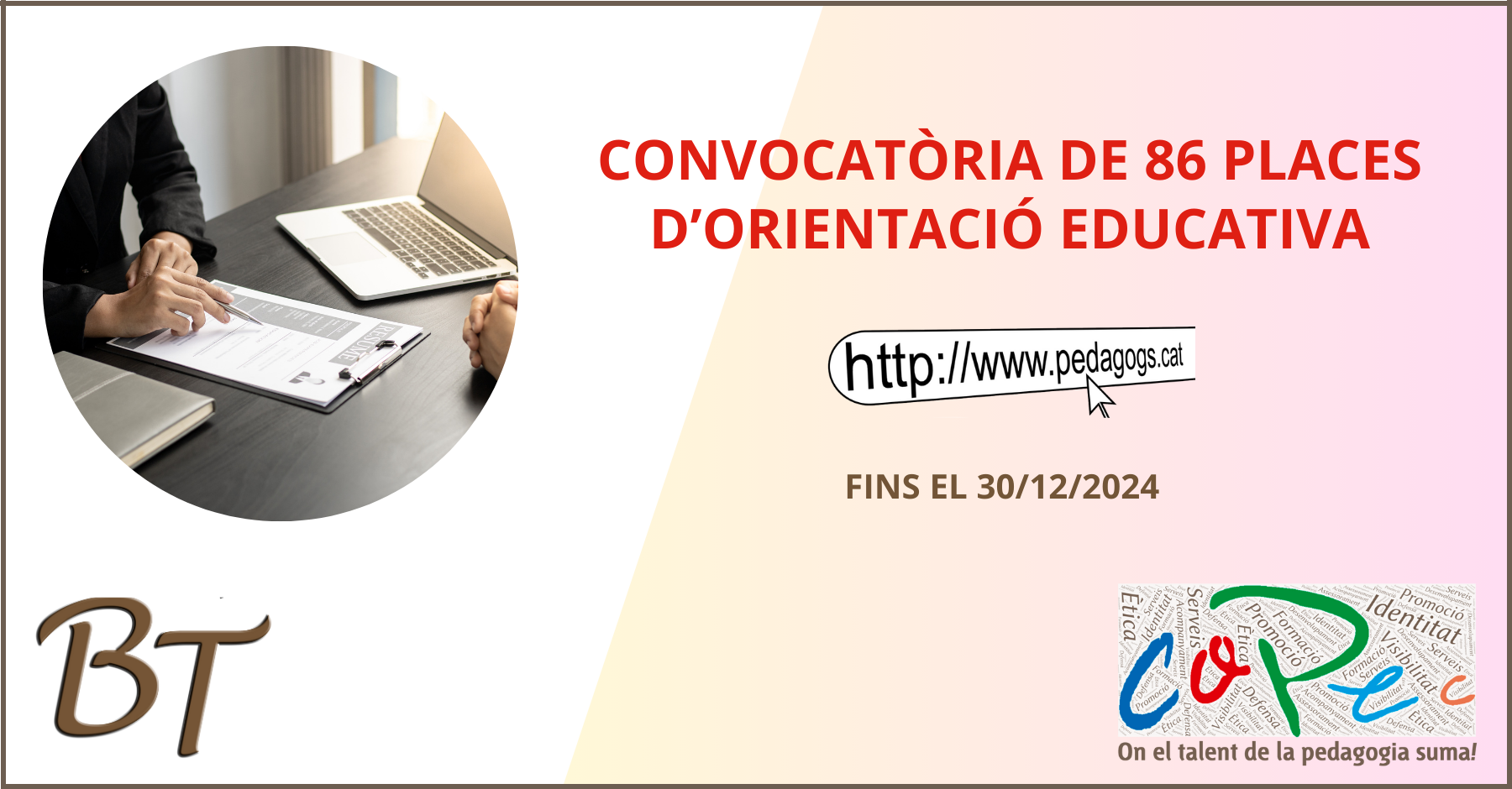 Desde el Col·legi Oficial de Pedagogia de Catalunya, queremos destacar que de las 495 convocadas, 86 son de ORIENTACIÓN EDUCATIVA, especialidad por excelencia del PEDAGOGO/A y PSICOPEDAGOGO/A.