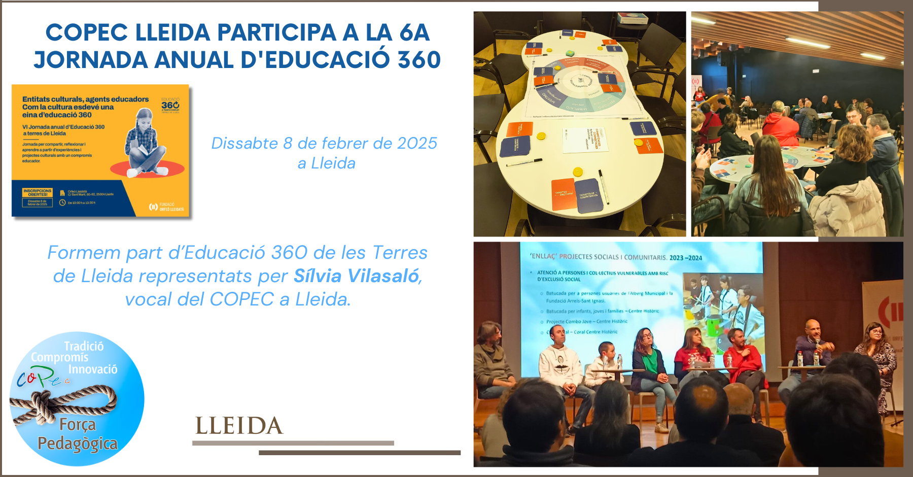 El COPEC forma parte de la Xarxa d’Educació 360 a Lleida, representados por Silvia Vilasaló, vocal del COPEC en Lleida, quien también será la moderadora de la mesa de experiencias titulada “¿Cómo conectamos la cultura con la educación?”. Esta mesa de experiencias contará con la participación de diversos grupos y entidades culturales de la región, como la Fundación Orfeó Lleidatà, el Grupo Sardanista Montserrat, el Grupo Cultural Garrigues, el Caballero Narcís de Ivars d’Urgell, el Casal Popular l’Arreu de Mollerussa y Corrandescola Ponent.