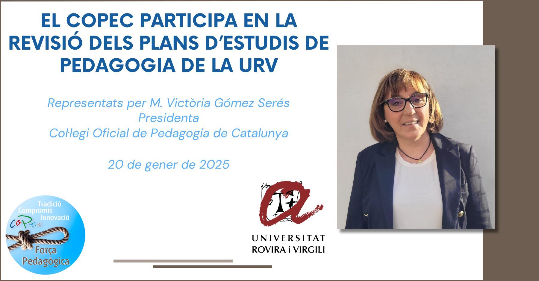 Ayer, el COPEC, representado por la presidenta M. Victòria Gómez, participó en la revisión de los planes de estudio del grado en Pedagogía de la Universidad Rovira y Virgili (URV) como miembro del Consejo Asesor. Esta colaboración tiene como objetivo garantizar que la formación de los futuros pedagogos y pedagogas responda a las necesidades reales de la profesión y promueva una preparación excelente en sus tres grandes contextos de actuación: Contexto educativo formal, contexto social y contexto empresarial/laboral.