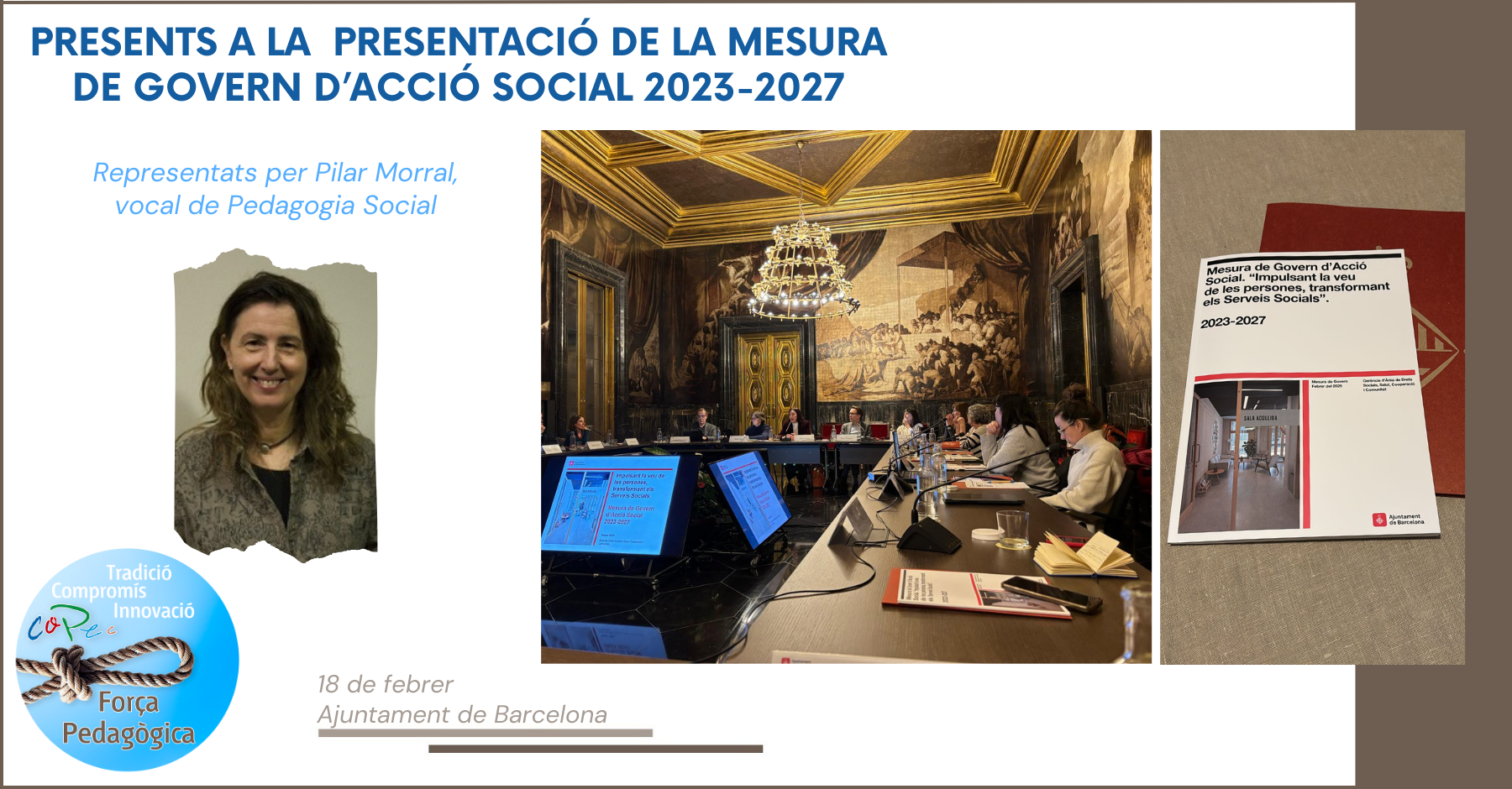 Ayer, 18 de febrero, el Ayuntamiento de Barcelona reunió a diversas entidades y colegios profesionales para presentar la Medida de Gobierno de Acción Social 2023-2027: "Impulsando la voz de las personas, transformando los Servicios Sociales", de la que estuvimos representados porPilar Morral, vocal de Pedagogía Social.