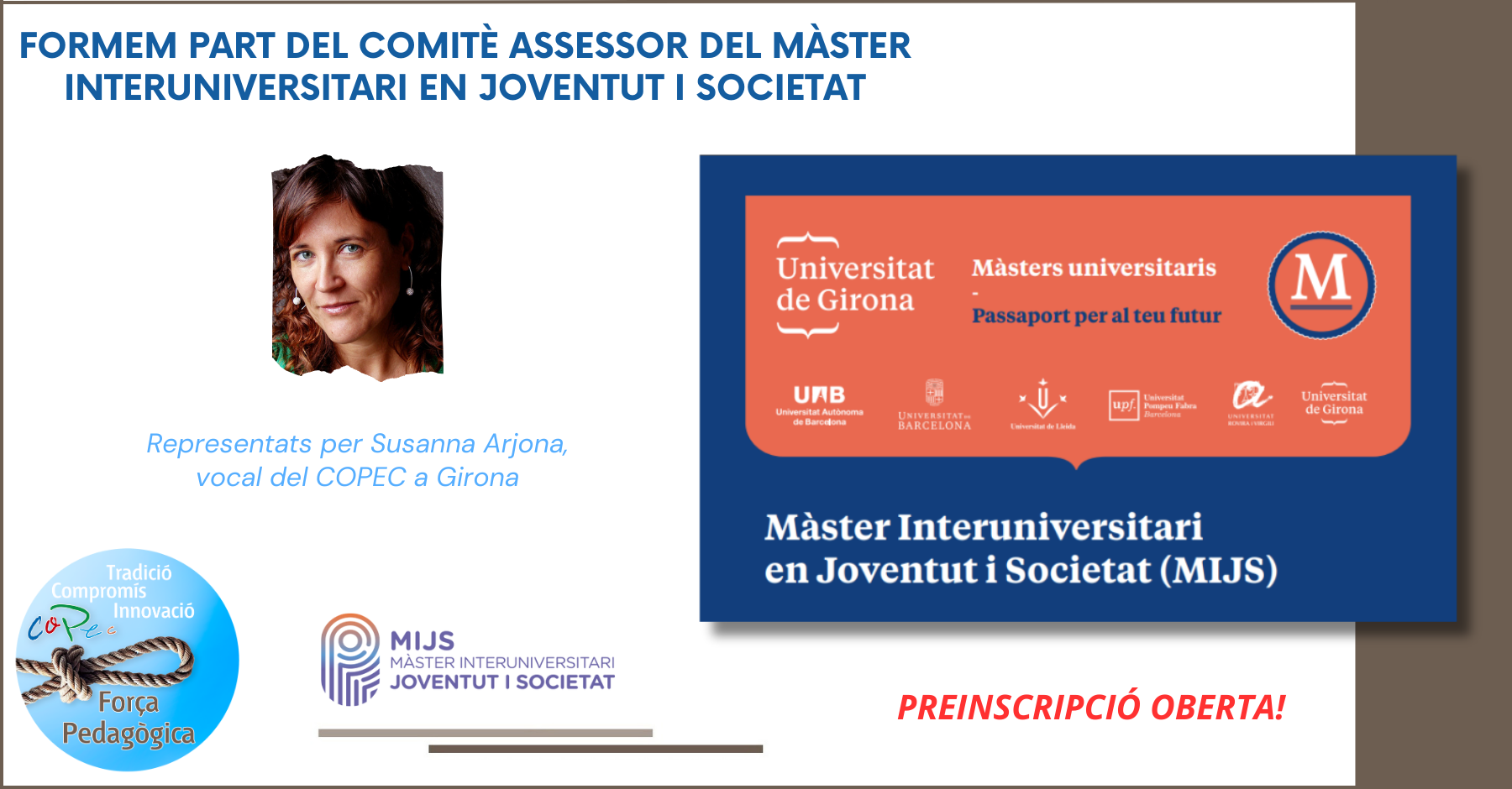 Ya se ha abierto la preinscripción para el Máster Interuniversitario en Juventud y Sociedad (MIJS) para la edición 2025-2026, un programa académico diseñado para aquellos interesados/as en el trabajo con jóvenes, la investigación en juventud y las políticas de juventud. En esta edición, el COPEC continúa formando parte del Comité Asesor del máster, con Susanna Arjona, vocal del COPEC en Girona, como representante.