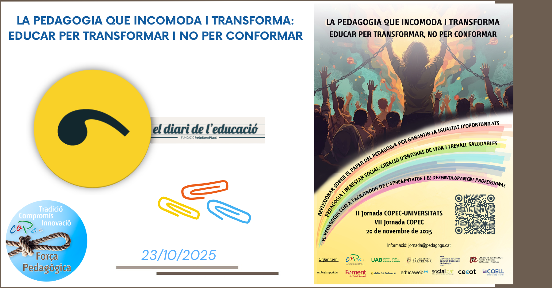 El Col·legi Oficial de Pedagogia de Catalunya en el marco de la colaboración con las universidades catalanas que imparten pedagogía, ha unido sinergias para reivindicar el papel esencial de la pedagogía en la sociedad y poner en valor a los pedagogos/as y psicopedagogos/as.