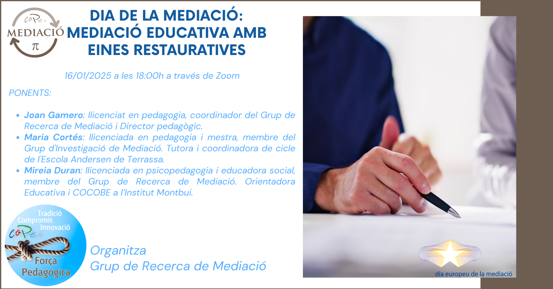 INICI > Activitats COPEC > DIA DE LA MEDIACIÓ - MEDIACIÓ EDUCATIVA AMB EINES RESTAURATIVES