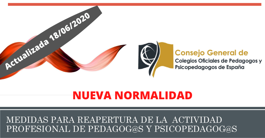 Amb data 28/04/2020, el Govern de l'Estat, presenta el PLA DE DESESCALADA, i el Consejo General de Colegios de Pedagogos y Psicopedagogogs elabora aquesta GUIA DE BONES PRÀCTIQUES per a garantir la seguretat en la reobertura de la nostra activitat professional i col·laborar en l'extinció de la pandèmia.