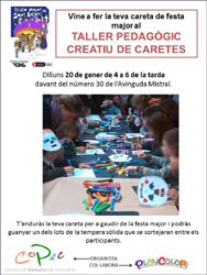 Vine el proper dilluns 20 de gener de 4 a 6 de la tarda amb els teus amics, coneguts, fills, pares, avis o veïns a fer la teva careta creativa al taller pedagògic que hem preparat al carrer, davant del número 30 de l’Avinguda Mistral de Barcelona, molt aprop del COPEC. Podràs guanyar un dels lots de la tempera sòlida que se sortejaran entre els participants.