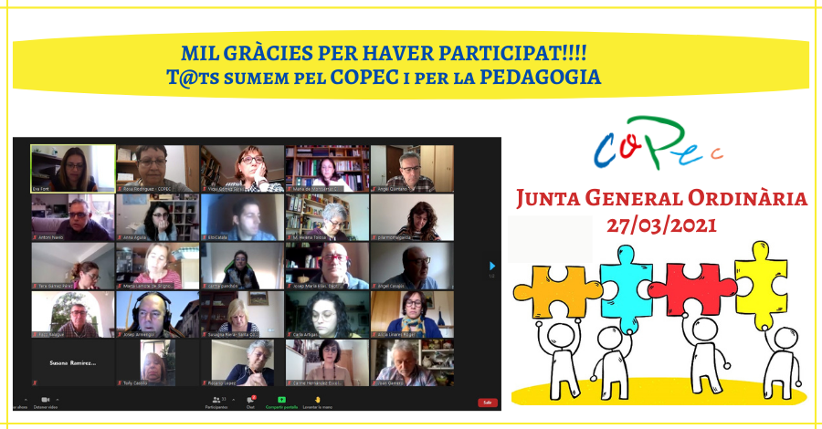 Benvingudes i benvinguts, tornem a ser aquí per a retre comptes a la JUNTA GENERAL dels col·legiats i col·legiades, del que ha estat aquest 2020 tan atípic, un any ple d’oportunitats que ha posat a prova la capacitat de resiliència de tothom. Després de saludar-vos voldria saludar molt especialment a dues convidades a aquesta Junta General, les alumnes de pedagogia en pràctiques, l’Anna Aguila de la URV i la Carla Artiga de la UB, i donar-les les gràcies per aquest aire fresc que, com alumnes de 4t de pedagogia, aporten al COPEC.