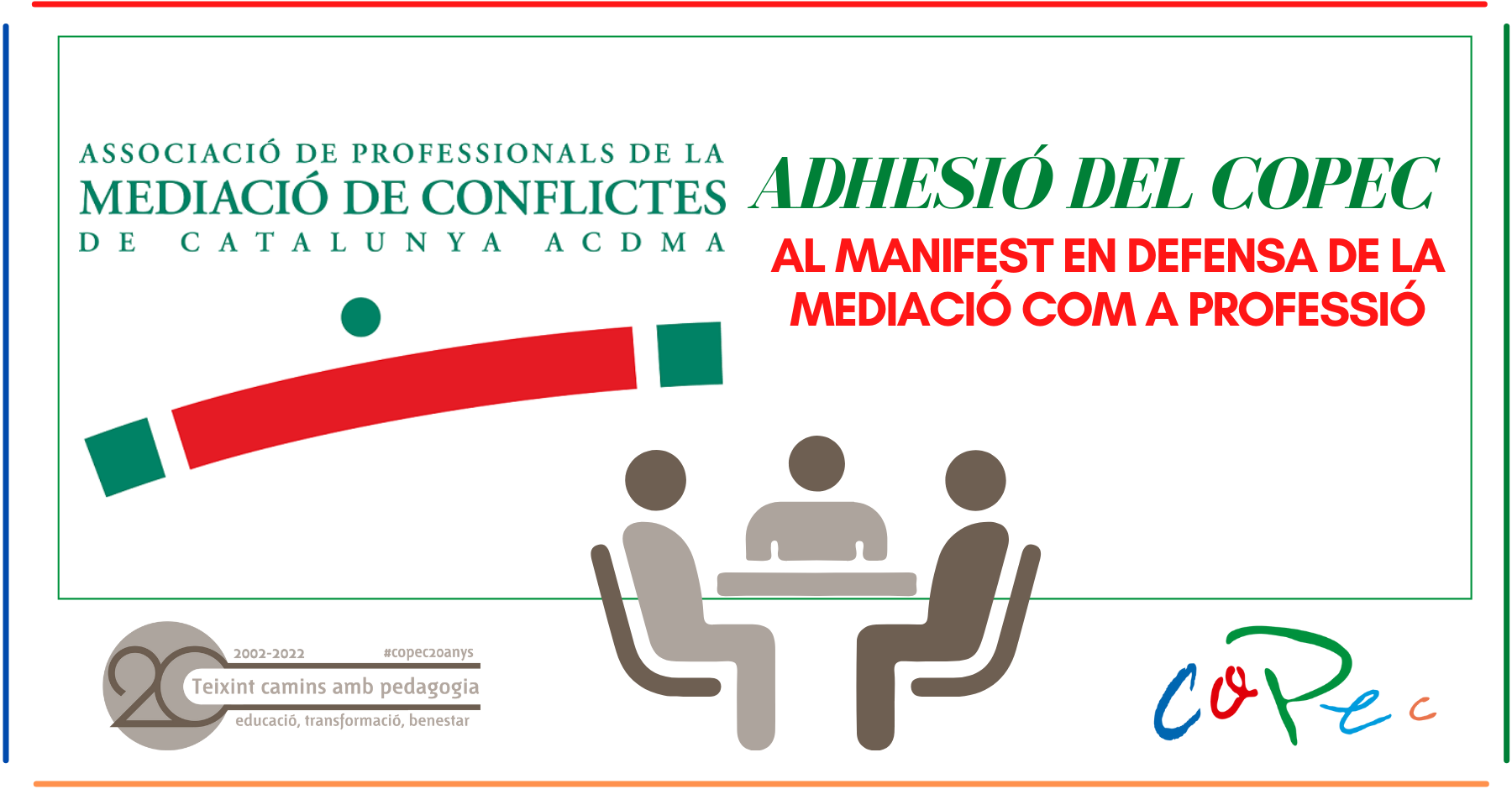 Però per davant de tot defensa que, en el cas del COPEC, als PEDAGOGS/GUES o PSICOPEDAGOGS/GUES amb l’especialitat de MEDIACIÓ, pel que estem d’acord en professionalitzar als mediadors/mediadores, dotant-los de més competències per al desenvolupament de llurs funcions, però no estaríem d’acord en substituir als professionals de la PEDAGOGIA amb l’especialitat de MEDIACIÓ.